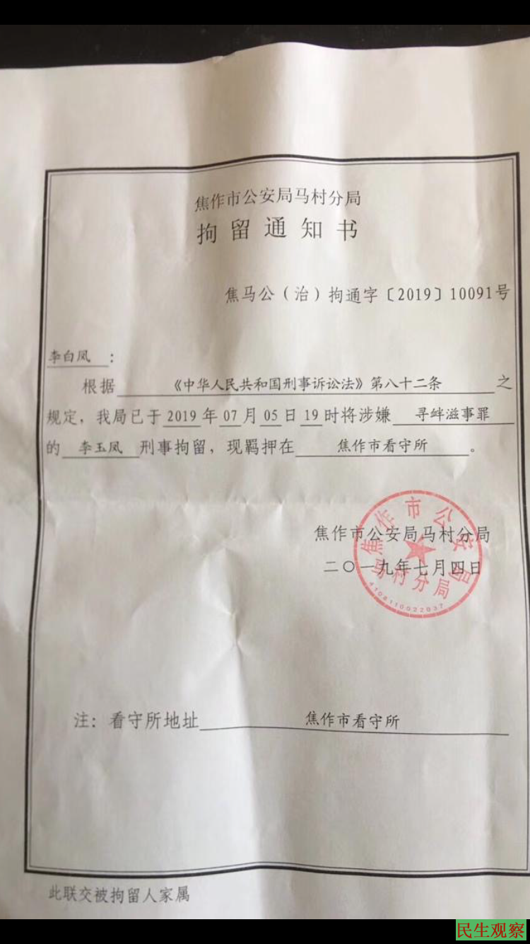 翌日一大早,李白凤便早早赶往焦作市马村公安分局,便拿到了姐姐李玉凤的《行拘通知书》,得知姐姐已被焦作马村当局以涉嫌“寻衅滋事罪”刑事拘留。