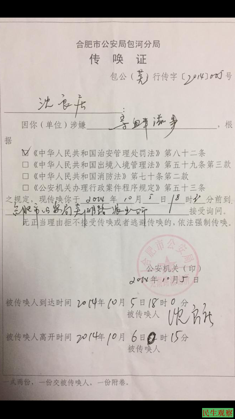 【民生观察2019年7月9日消息】本网获悉,安徽著名异议人士、前检察官沈良庆上个月(6月25日)其家属收到《逮捕通知书》,被证实已遭安徽当局以涉嫌“寻衅滋事罪”逮捕后,昨天(7月8日)刘浩律师在家属的陪同下再次成功会见到当事人沈良庆。 家属透露,沈良庆曾被国保提审要求其解除家属聘请的律师,由他们指定的律师为其辩护,遭沈良庆拒绝。