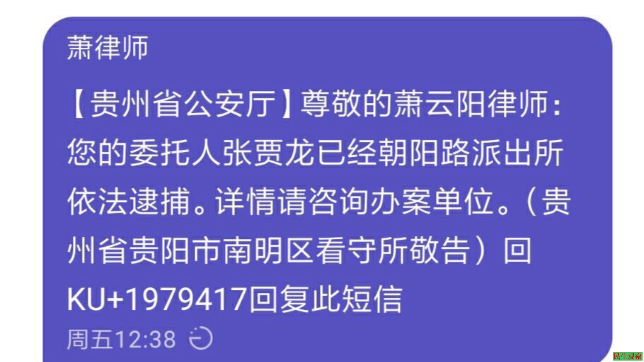 据悉,张案辩护人萧云阳律师于周五中午收到办案单位通过贵州省公安厅政务信息网发布的短信,得知张贾龙已被批捕的消息。该短信告知辩护律师张贾龙已遭批准逮捕,律师若有疑问可以向办案单位贵阳市朝阳路派出所进行查询。