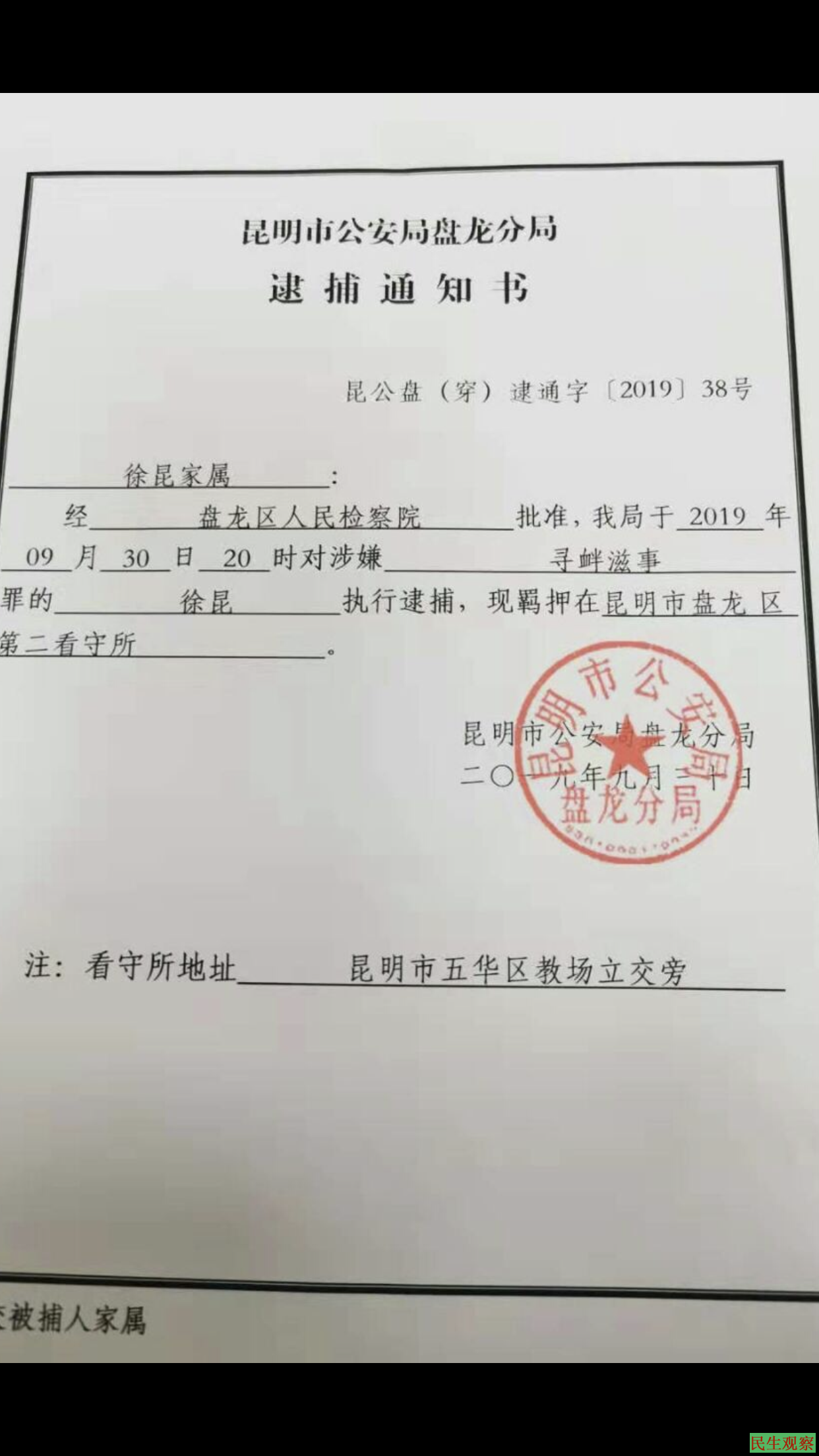 九月二十八日,盘龙检察院一男一女来提审,试图说服我认罪,我拒绝了。九月三十日逮捕。