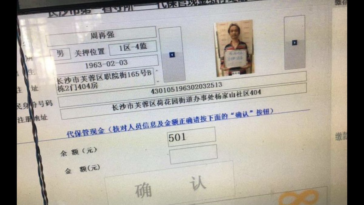 十一月一日,有网友在微信发出消息称:长沙公民周再强近日因在推特上发言支持香港反送中运动而被当局突然抓捕,并以寻衅滋事的罪名刑事拘留,目前已经确认被关押于长沙市第一看守所。
