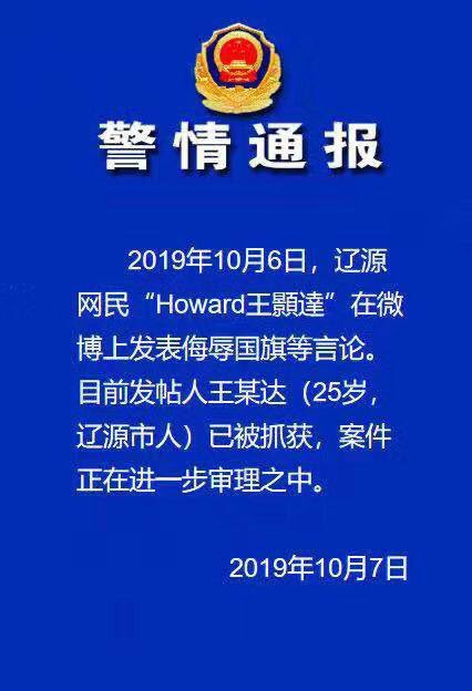 2019年10月6日,25岁吉林辽源公民王颢达微博上公开支持香港反送中运动,遭当地警方迅速抓捕。