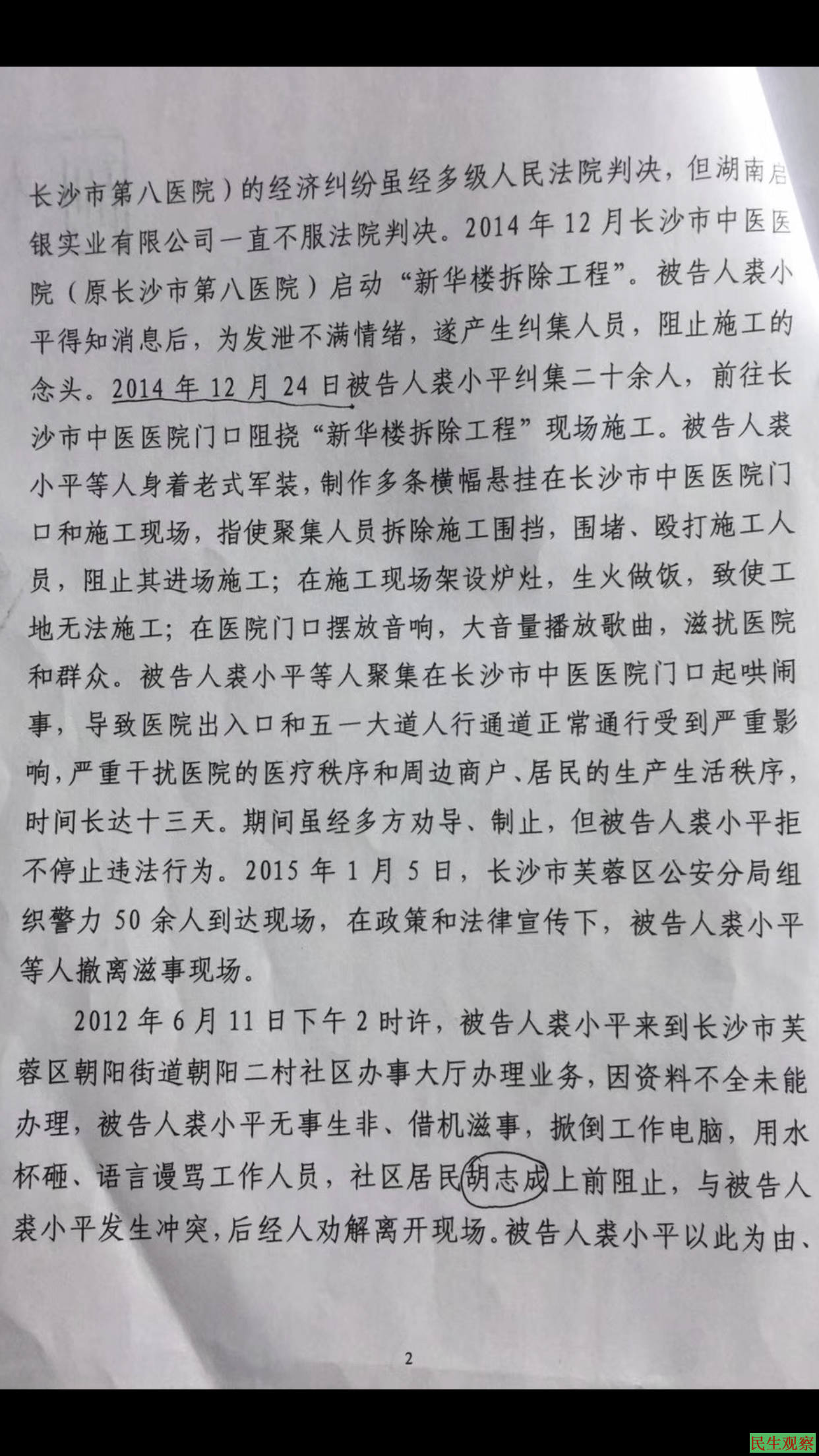 据知情人张先生透露,起诉书中提到的长沙原八医院拆除新华楼事件应属经济纠纷,是原八医院与启银公司的合同纠纷。