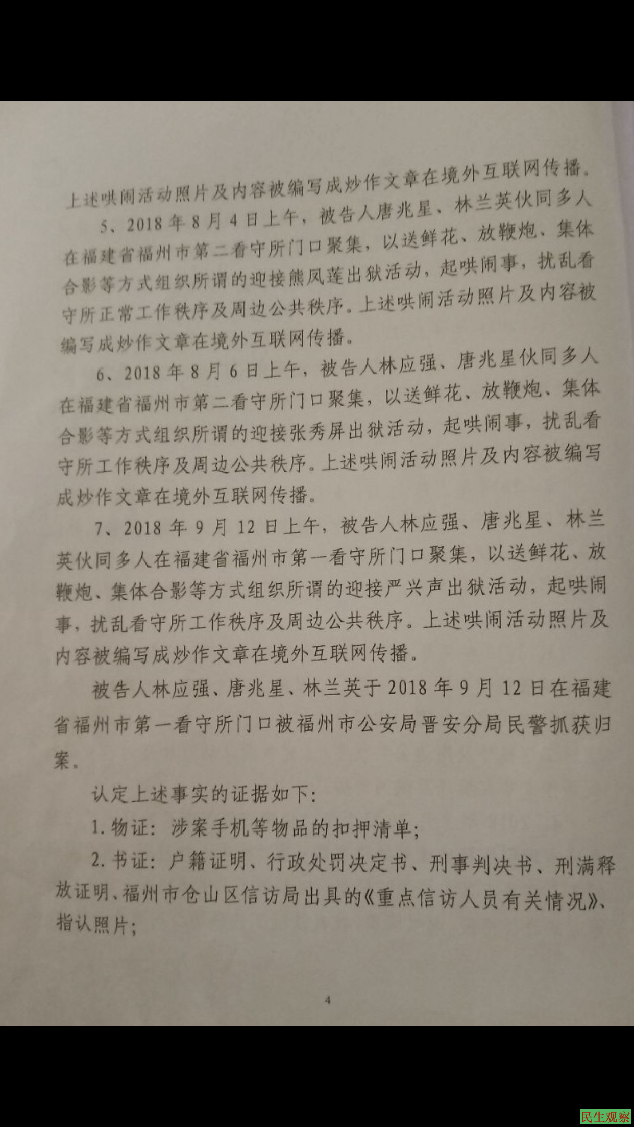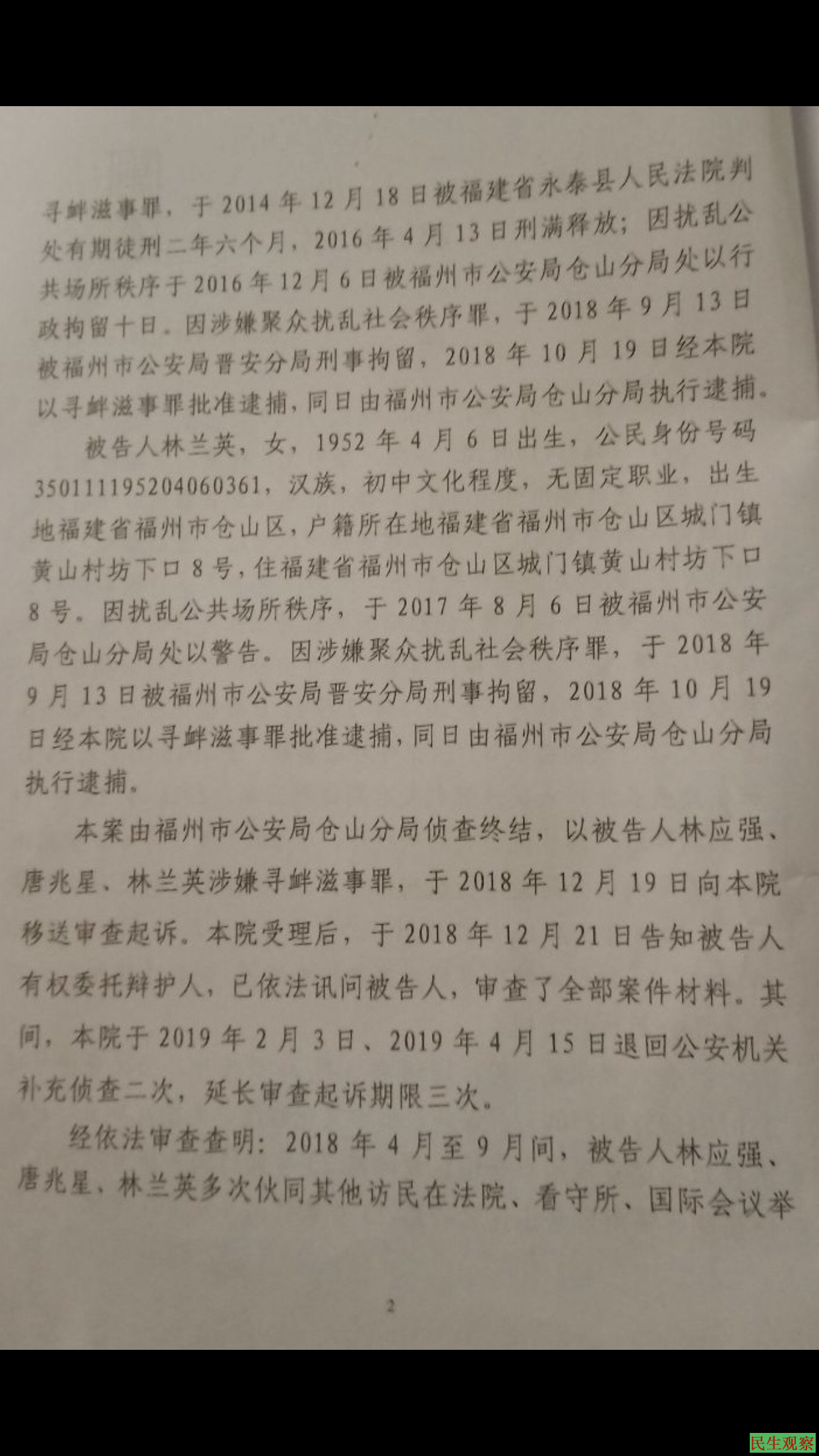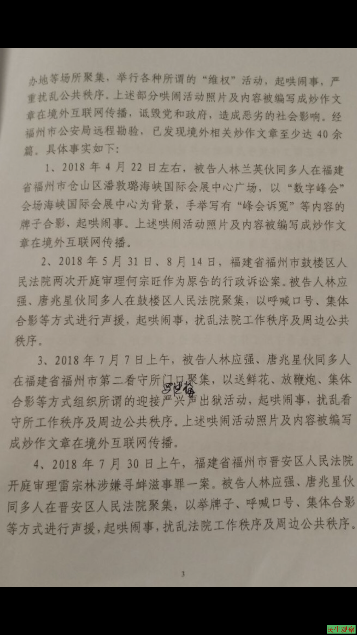【民生观察2019年11月23日消息】本网获悉,福州著名维权人士林应强、唐兆星、林兰英涉嫌寻衅滋事罪案于11月22日上午九点在福州市仓山区法院开庭审理。