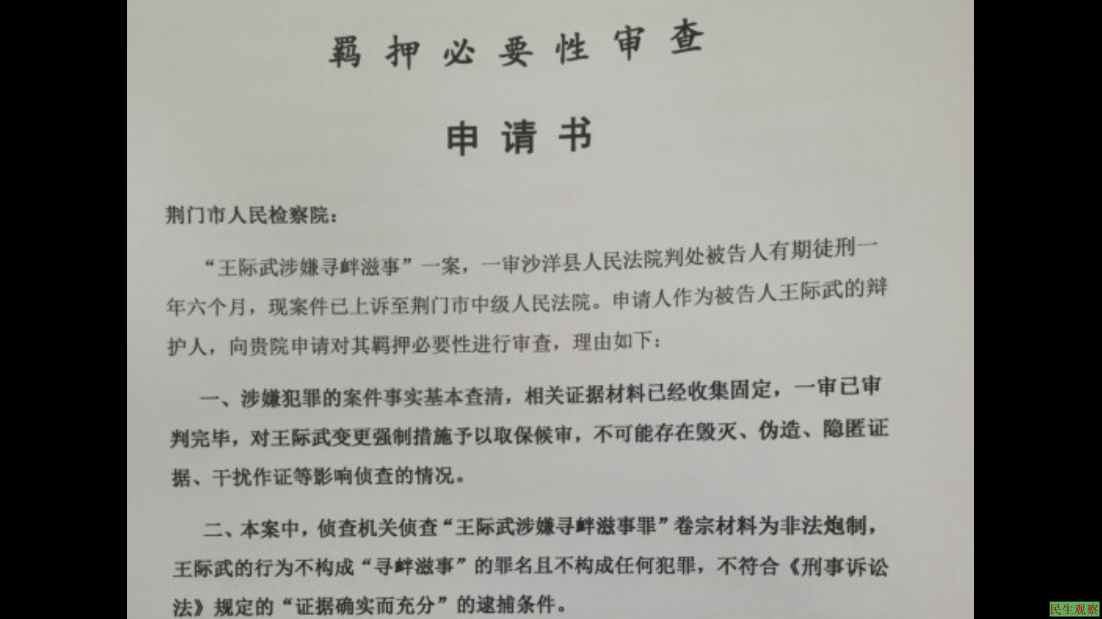 二审期间,王际武的家属向荆门市中级法院递交了取保候审申请书,也向荆门市检察院递交了羁押必要性审查申请书,但目前法院答复不予取保。王际武的家属非常担心,不知耿直倔强的老人还能坚持多久?