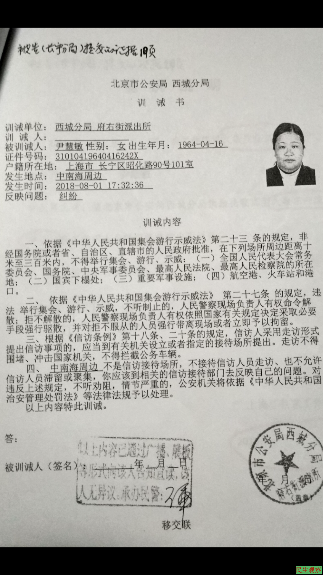 审判长符德强还包庇被告,企图隐捏尹慧敏当天庭审递交的3份证据材料,即北京市高级人民法院裁定书和北京市西城公安分局信息公开答复“训诫书不是立案移交单,不能作为地方公安处罚上访人的执法依据”这是最权威性的裁定和定论。符德强要求尹慧敏写仅供法庭参考,但尹慧敏是作为证据提交给法庭的,但是符德强,强迫尹慧敏写“仅供法院参考”。对于尹慧敏提交的2007年第一被告长宁分局于2007年4月制作和出具的一份假的无公章,无案号,无承办人签名,字迹模糊不堪的伪造的假的《行政处罚决定书》不予以法庭质证。让人怀疑,符德强这是企图毁灭原告的证据。