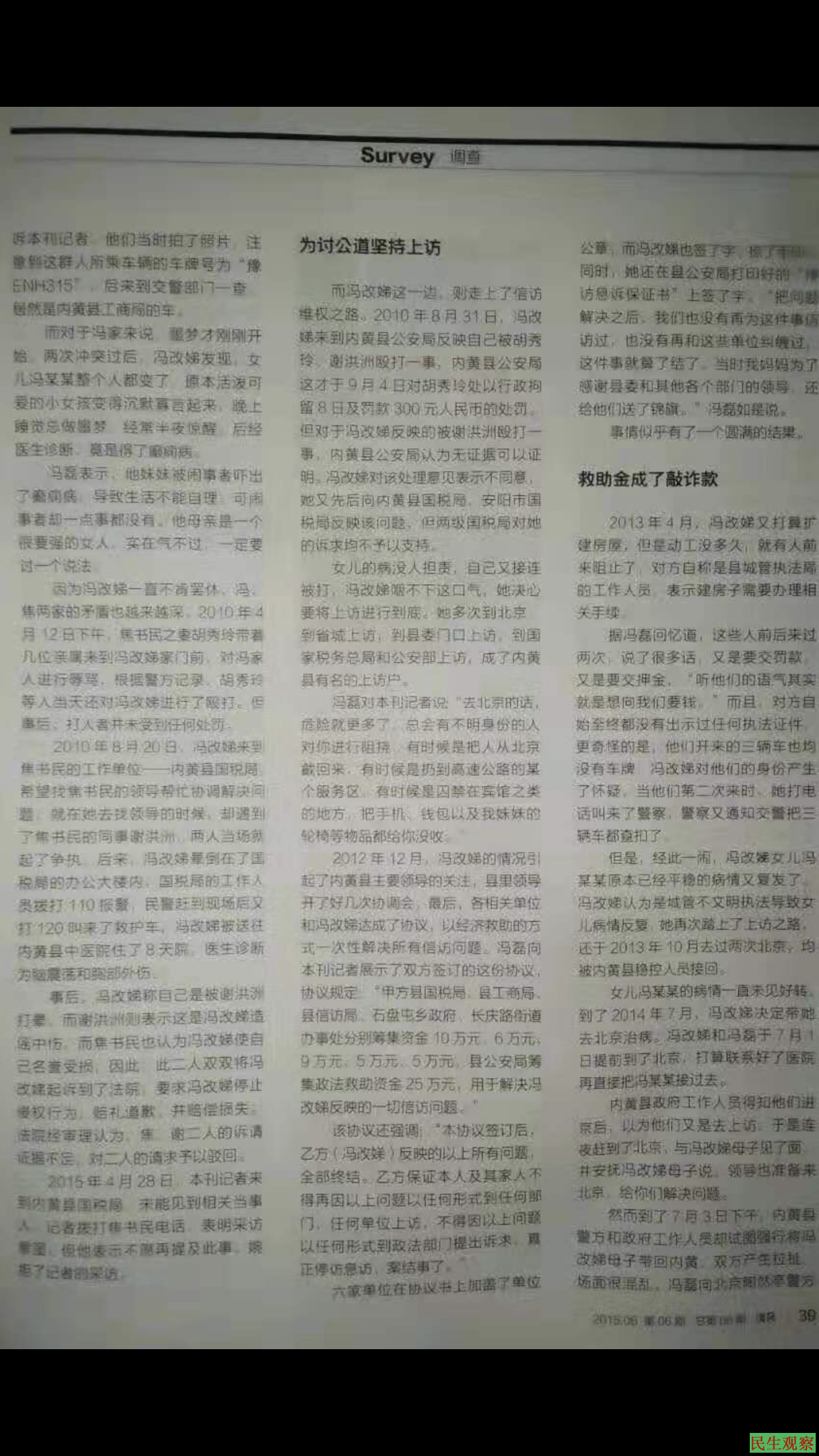 同年12月20日,内黄县工商局、国税局、石盘屯乡政府、长庆路办事处、公安局、信访局六家单位签订了协议,支付冯改娣社会救助金60万元,换取其在停访息诉保证书上签字。