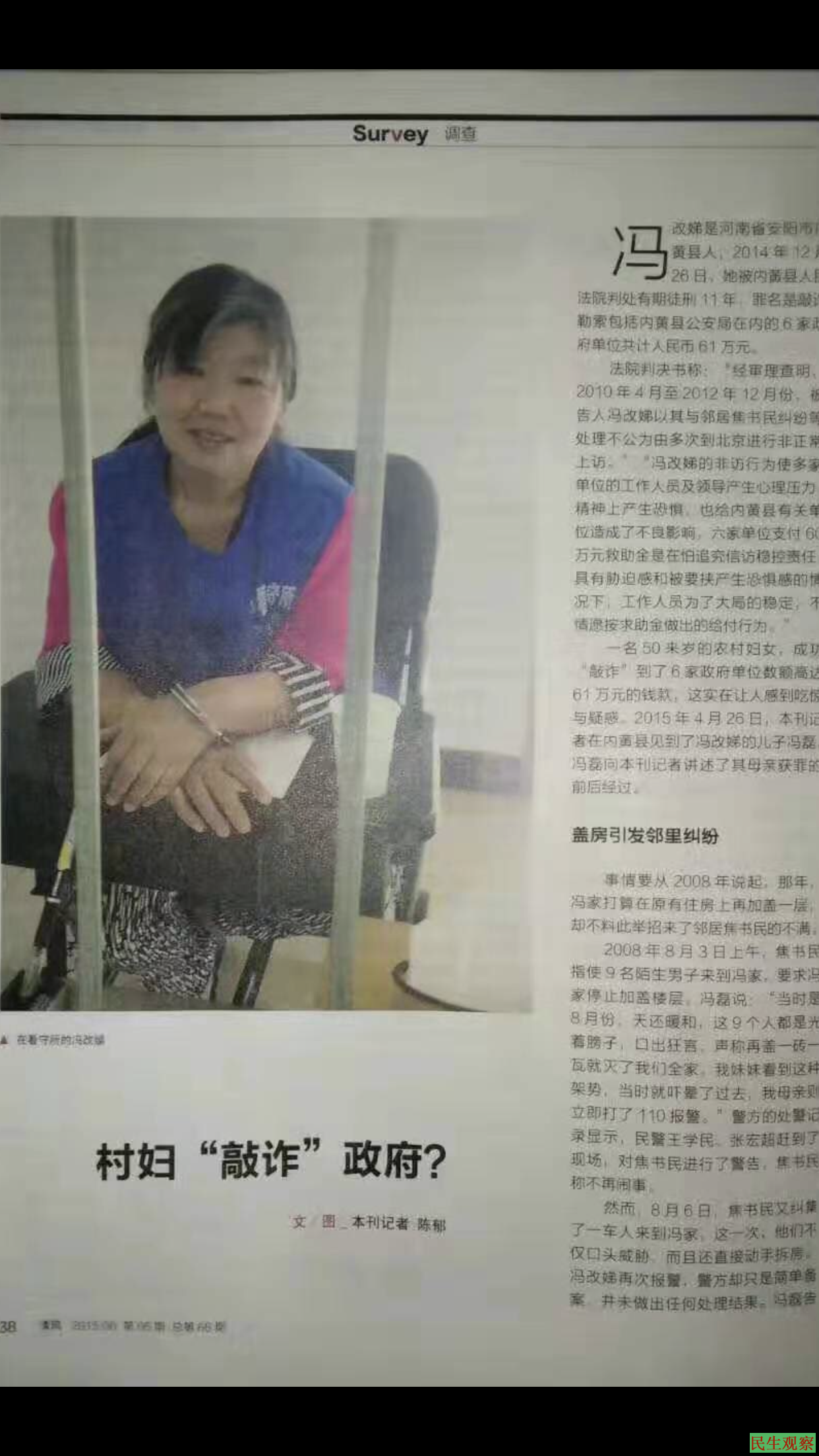 因为多年上访,2014年7月22日冯改娣被河南省内黄县公安局以涉嫌敲诈勒索罪刑拘,羁押在安阳市看守所。