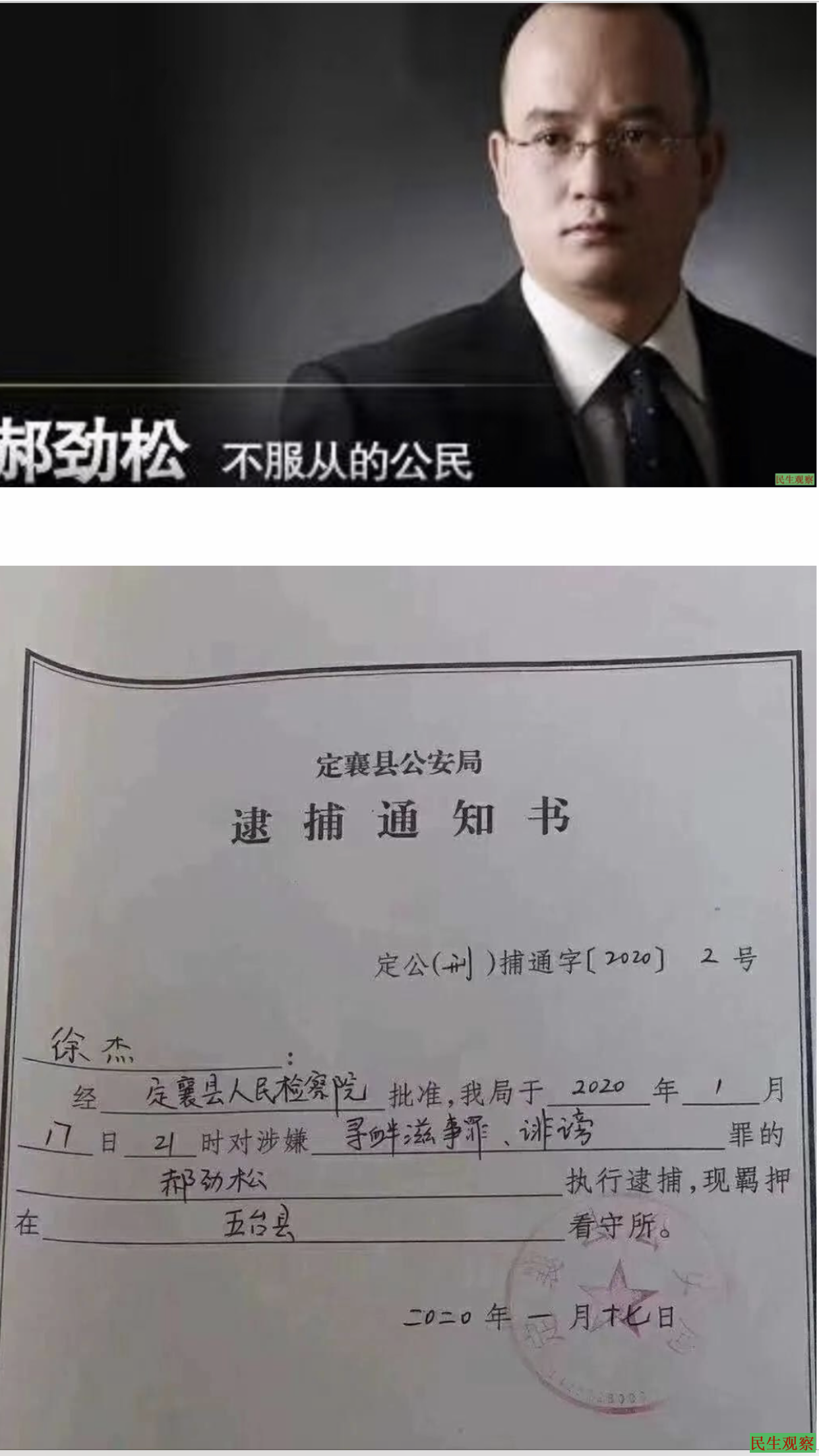 2020年1月2日下午,行政拘留期满,郝劲松又因涉嫌寻衅滋事罪被定襄县公安局刑事拘留,并羁押于忻州市五台县看守所。2020年1月17日,郝劲松的家属接到了逮捕通知书。