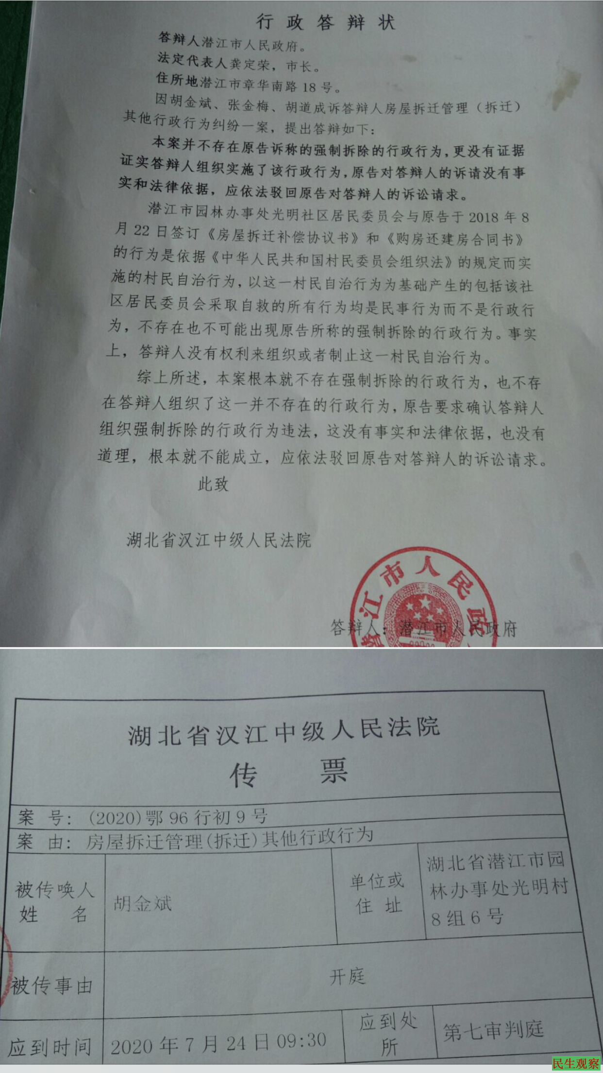 【民生观察2020年7月26日消息】湖北潜江七名维权人士到湖北省汉江人民法院旁听强拆一案开庭,原告胡金斌是一位退役军人曾今保家卫国今日却遭到无家可归。开庭时间为上午9点半,去参加旁听的有7个人,他们是:潜江维权人士彭峰,有被强拆江尚芝,陈喜珍,还有银行下岗维权人士伍立娟。进入旁听只允许5个人是;陈喜珍,彭峰,伍立娟,王先生,还有一位潜江紫月村被强拆的朋友。