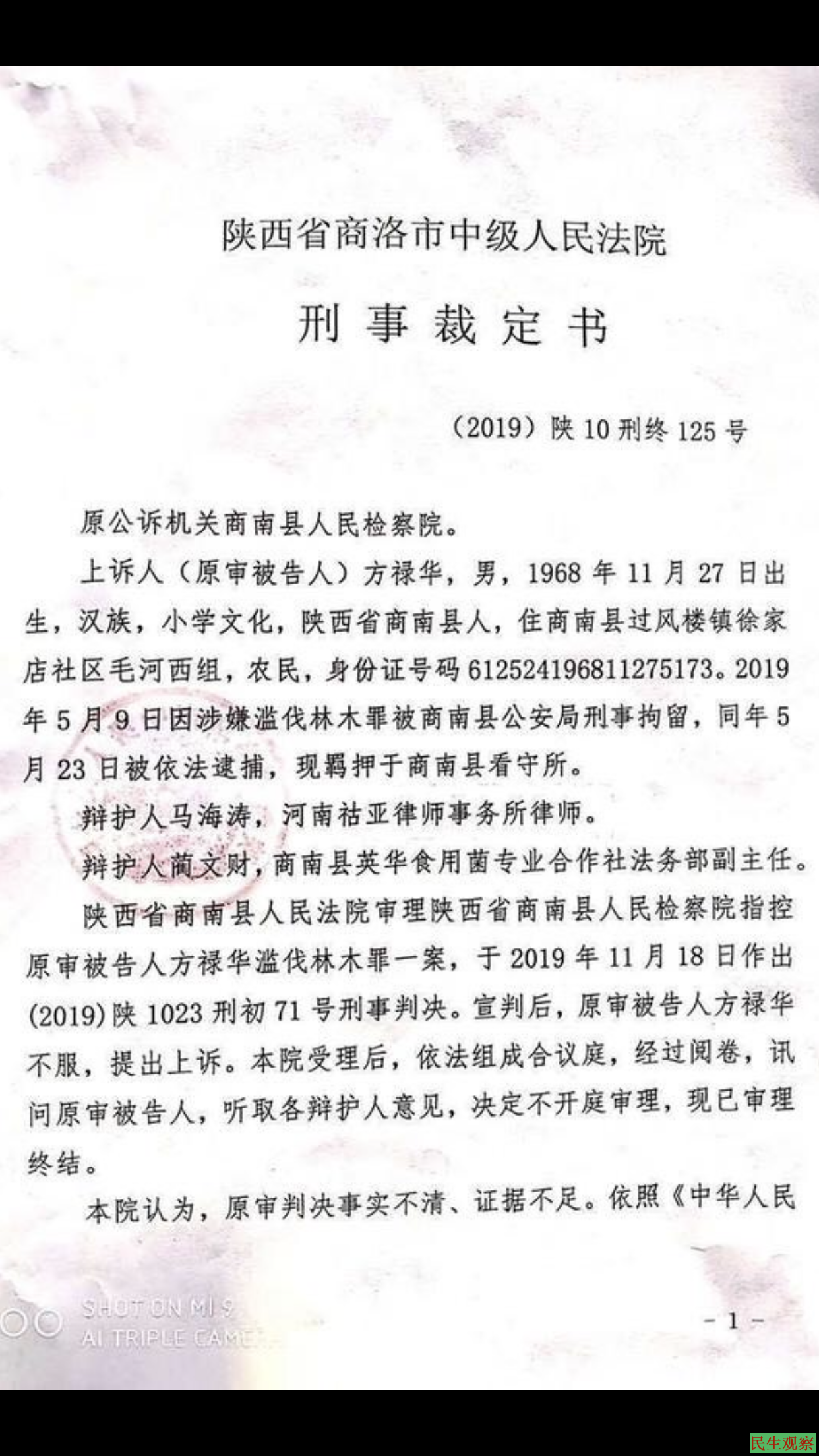 据方禄华“滥伐林木”案的一审判决书显示,2019年5月,商南县公安局以涉嫌“滥伐林木”将方禄华抓捕,2019年11月,商南县人民法院一审作出(2019)陕1023刑初71号刑事判决,方禄华获刑三年又二个月。不过,方禄华“对公诉机关指控的犯罪事实及罪名均不予认可”。