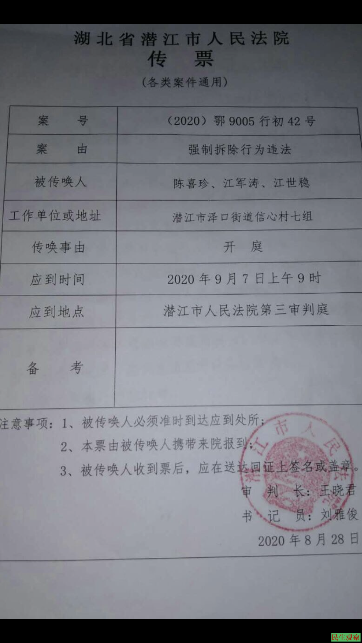 【民生观察2020年9月9日消息】湖北省潜江市维权公民遭到非法绑架关押101天的陈喜珍在关押期间遭到强迫签字后被非法暴力强拆一案,7日上午9点在湖北潜江市法院二楼第三审判庭开庭,参加声援旁听的维权公民有20多人他们是;彭峰,张玉还,丁元顺,伍立娟,黄行芝,潘向荣,朱双英,余金桂,万小云,陈美玲,胡金斌,李万秀,江尚芝,余后群,王国爱,汪大海,秋永红,逍遥客等等,但是真正进入开庭旁听的只有四个人;张玉还,丁元顺,彭峰,伍立娟,四个人,其他声援旁听人员不得进入旁听,其实庭审室空荡无人,只有张玉还,彭峰,丁元顺,伍立娟四个人,被告方没有相关部门负责人来参加旁听。