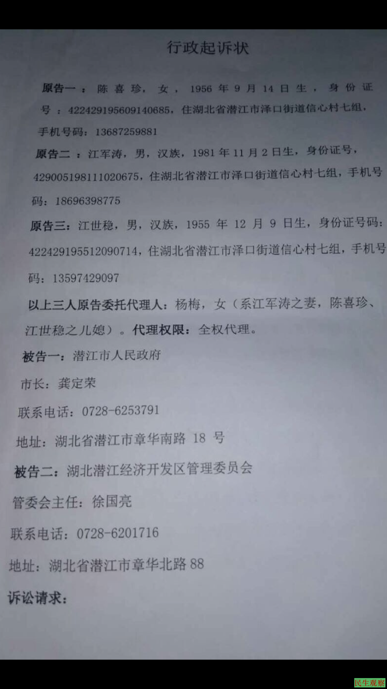 三原告系潜江市信心村村民,其房屋位于潜江市信心村7组13号,2019年7月18号,陈喜珍住房被违法强坼,原告当即报警经公安机关查证后确认该强坼为本案两被告组织安排实施,经查,2018年潜江市因经济建设需要,第一被告潜江市市长龚定荣2018年度第79批次城市建设用地似征收潜江经济开发区信心村集体土地原告房屋及土地位于该征收批次范围内。