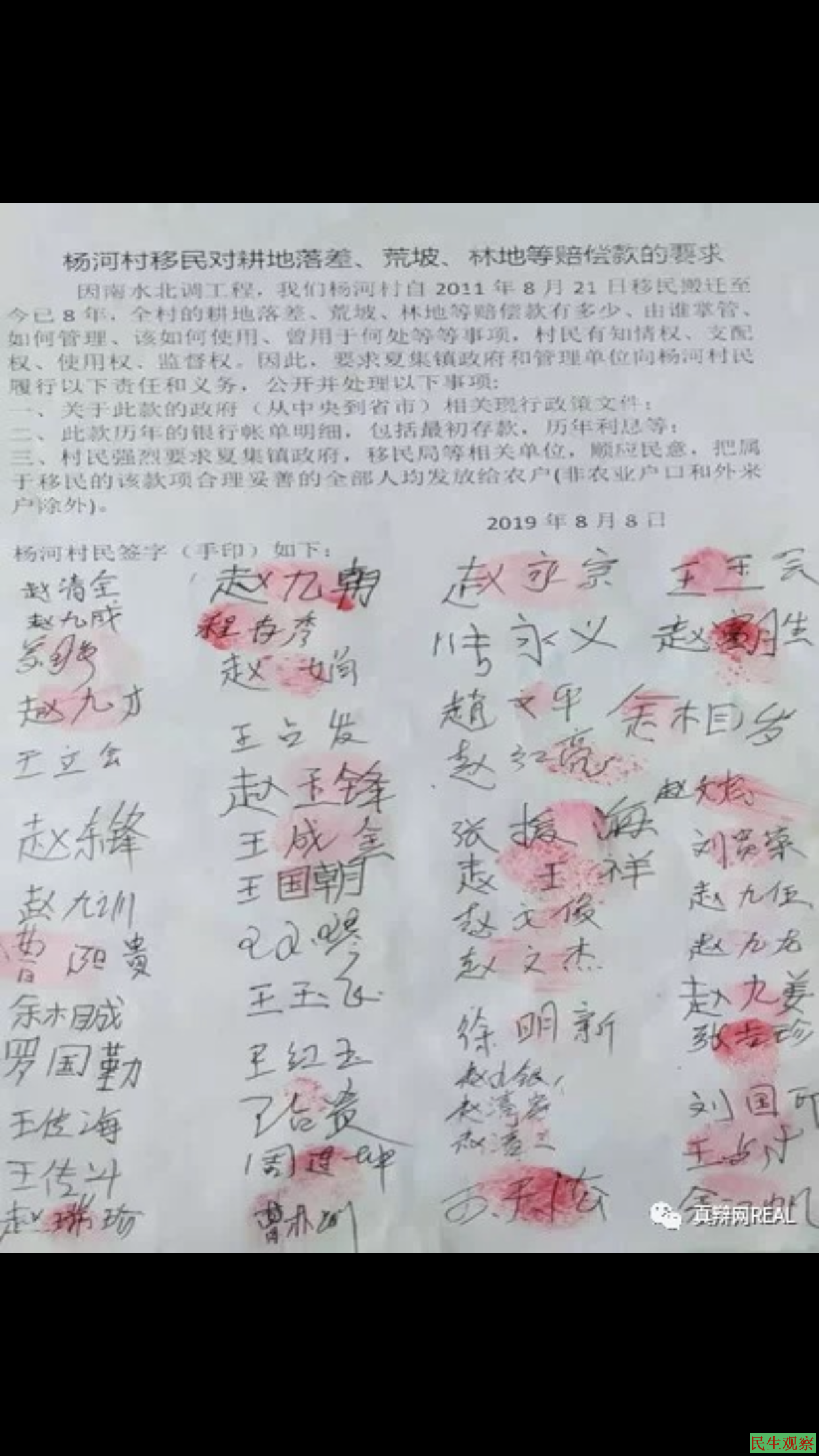 一份杨河村村民集体签字的《杨河村移民对耕地落差、荒坡、林地等赔偿款的要求》显示,为南水北调工程搬迁8年之后,赔偿金数额、用途、保管等事项,村民仍一无所知。