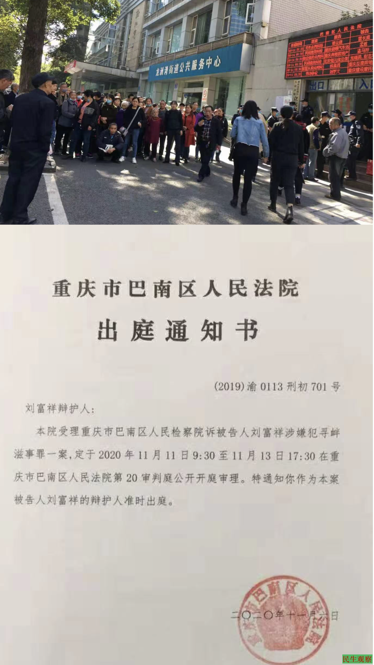 法院门口的法警告诉大家说可以在网上看庭审直播,大家纷纷在手机上搜索中国庭审公开网,输入案号[(2019)渝0113刑初701号],却没有相关直播视频,只有一个2020年11月13日下午的庭审预告(该案原定是2020年11月11、12、13日连续三天开庭审理)。