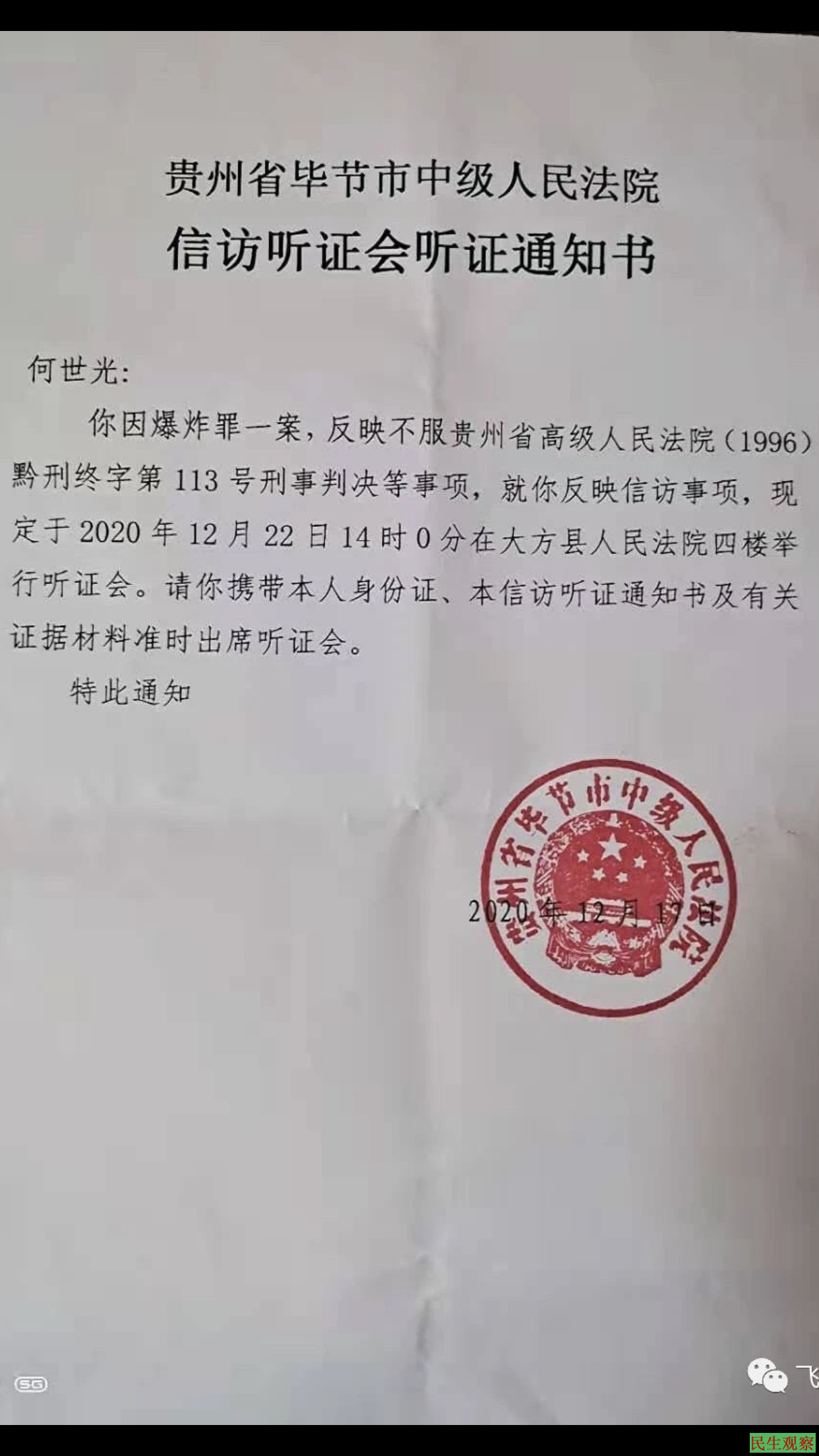 2020年12月17日,何世光收到毕节中院的信访听证通知书,通知其2020年12月22日14时在大方县法院四楼举行听证会。