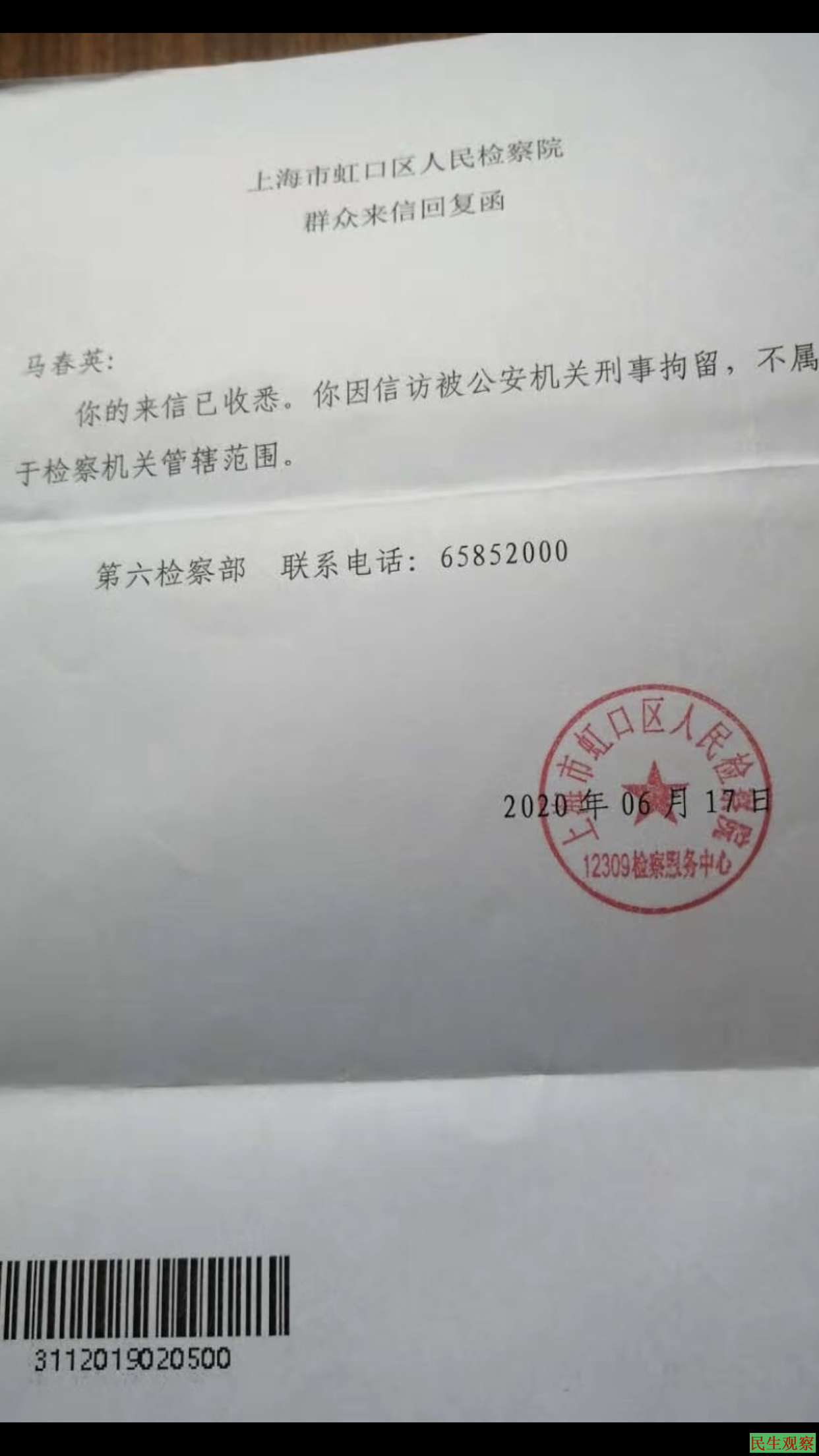 如此重大的暴力截访,简直是故意伤害,说有故意“杀人”嫌疑也不过分,但是虹口区检察院回复马春英“不属于检察机关管辖范围”(函件编号:3112019020500,第六检察部)。求助希望落空,人民检察机关本末倒置。