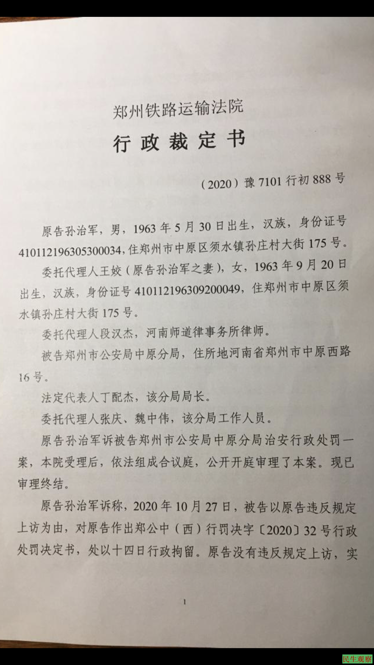 于上周日(12月27日)孙治军状告郑州市公安局中原分局治安行政处罚案,其行政代理律师段汉杰收到郑州铁路运输法院《行政裁定书》。