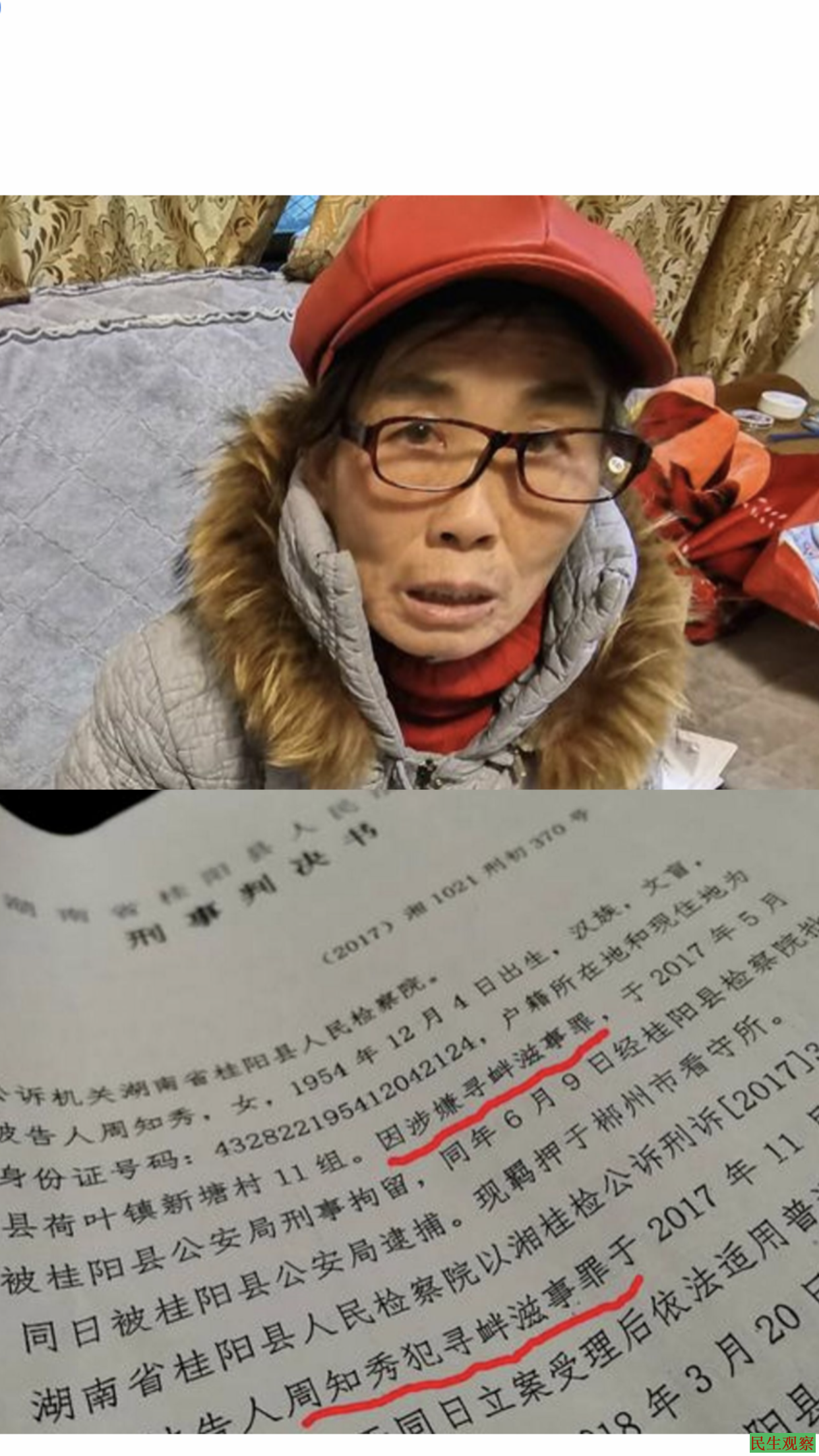 【民生观察2021年1月12日消息】本网获悉,湖南郴州桂阳县访民周知秀(女,66岁),因为坚持举报村干部贪腐而惨遭暴打,随后她就多次到信访局上访,但却被桂阳维稳部门非法截访稳控。其后,她又因躲过监控进京上访,被郴州公检法以犯“寻衅滋事”罪为名判刑11个月。