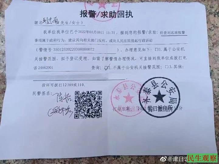 3月8日下午3点许,刘忠南又报了110,派出所出警把他接到了派出所里,笔录也没做。到晚上9点多,给他开了个回执称:是政府行为不予公安受理范围。
