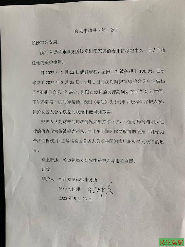【民生观察2022年5月31日消息】湖南人权律师谢阳被以涉嫌煽动颠覆国家政权罪抓捕,至今已被非法羁押140天。近日,代理律师纪中久第三次要求会见谢阳被拒。