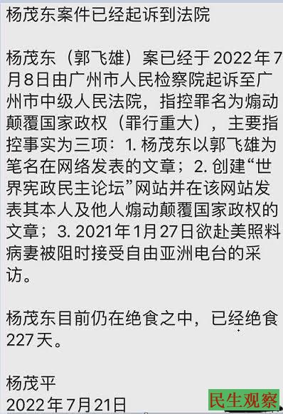 【民生观察2022年7月22日消息】2021年12月5日,湖北维权人士、独立作家杨茂东,因要求出境赴美探望病妻被抓捕羁押至今,目前已绝食抗议两百多天,其煽动颠覆国家政权案已被起诉到法院。