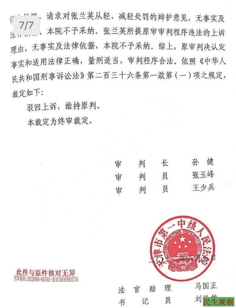 【民生观察2022年8月14日消息】8月13日晚上18点接到天津朋友来电说:张兰英以寻衅滋事罪判刑三年,二审败诉维持原判,张兰英的代理律师常伯阳做了无罪辩护。