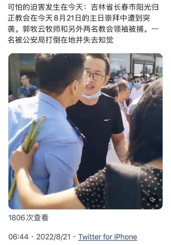 8月21日上午,吉林省长春市阳光归正教会,被当地警察冲入聚会场所,强行驱散,并带走张勇牧师、曲洪亮长老和信徒张亮亮。中间警察暴力执法,其中两位女信徒突发心脏病,打了120送医院救治。