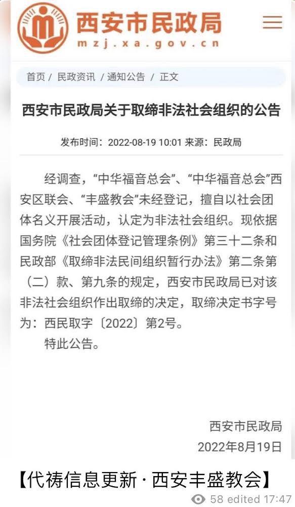 另外,西安丰盛教会于2022年8月19日被政府取缔。8月19日,西安市民政局发布通告称,经调查,“中华福音总会”、“中华福音总会”西安区联会、“丰盛教会”未经登记,擅自以社会团体名义开展活动,认定为非法社会组织。