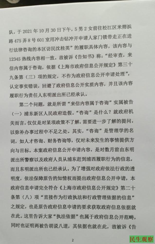 2021年10月30日下午,浦东新区访民沈桂英来到宋嘉鸿位于松江区佘山镇米筛浜路的家中,两人一起拟写“行政复议申请”,沈桂英要求上海市公安局撤销编号:SQ002420447120210813003“告知书”,并依法提供她所需的政府信息。