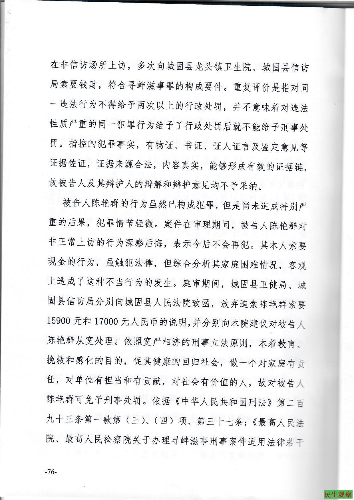 【民生观察2022年9月24日消息】2022年9月9日上午,城固县法院在该院科技法庭宣判陈艳群涉嫌寻衅滋事一案,判处陈艳群犯寻衅滋事罪,免予刑事处罚(附后)。宣判后,陈艳群对该判决不服,坚持认为自己无罪,于2022年9月19日向汉中市中院提起上诉。