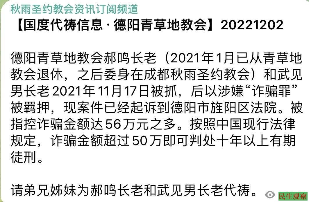 【民生观察2022年12月3日消息】2021年11月17日,德阳青草地教会郝鸣长老和武见男长老被以涉嫌“诈骗罪”抓捕羁押至今,现案件已经起诉到德阳市旌阳区法院,目前被指控诈骗金额达56万元之多,或将判处十年以上有期徒刑。