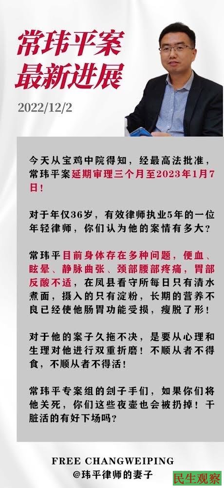 【民生观察2022年12月6日消息】2022年12月2日,从宝鸡中级人民法院得知,经最高法院批准,常玮平案延期审理三个月至2023年1月7日。常玮平目前的身体存在多种问题。