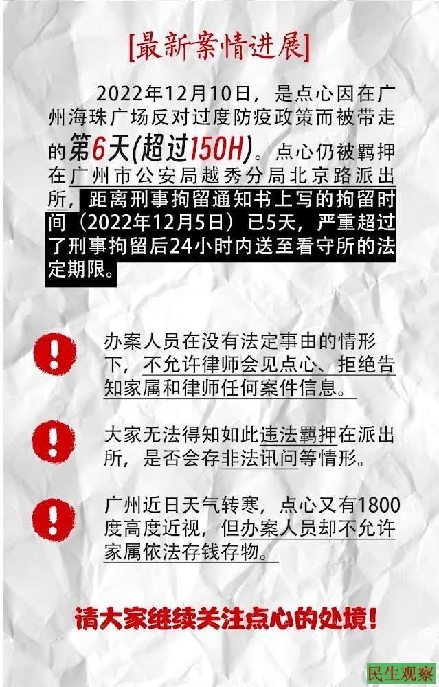 最新案情进展:2022年12月10日,是点心因在广州海珠广场反对过度防疫政策,而被带走的第6天(超过150小时)。点心仍被羁押在广州市公安局越秀分局北京路派出所,距离刑事拘留通知书上写的拘留时间(2022年12月5日)已5天,严重超过了刑事拘留后24小时内送至看守所的法定期限。