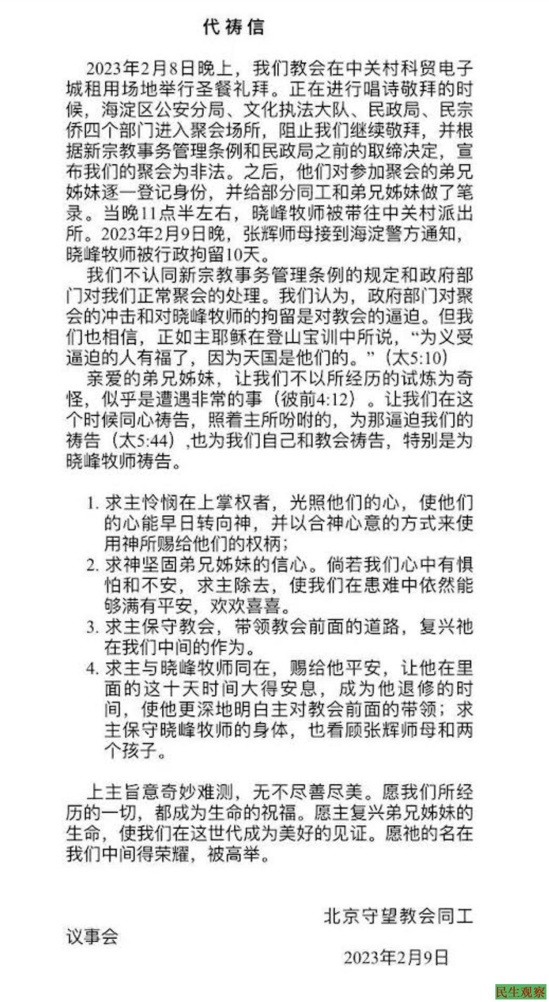 2023年2月9日,北京守望教会同工议事会发布代祷信称: