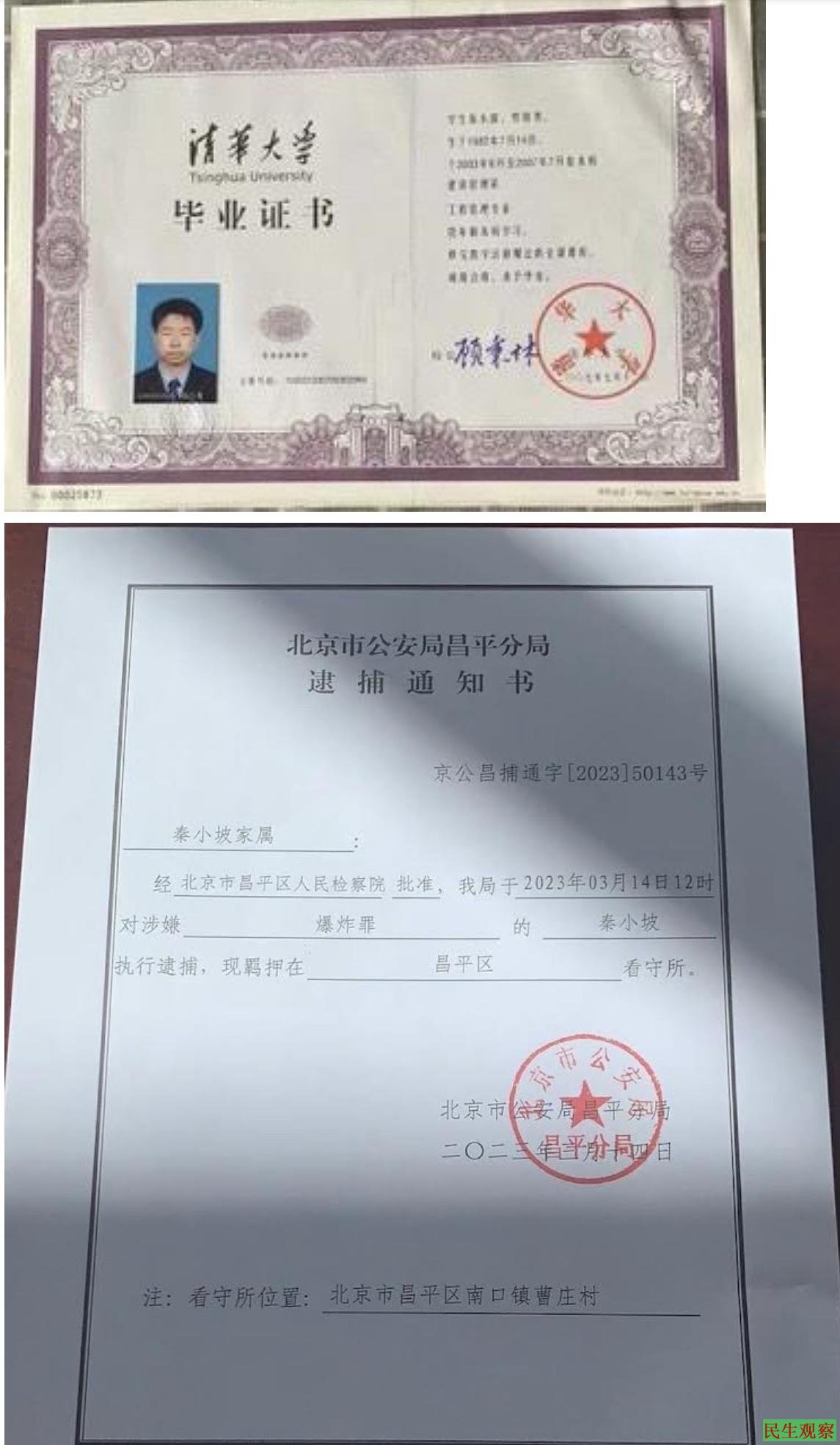 【民生观察2023年3月17日消息】本网获悉,北京市昌平区东小口镇秦荣、高和平夫妇房屋遭遇强拆,其子秦小坡因保卫家园、抵抗强拆被抓走,以非法持有爆炸物罪被监视居住6个月,期满后于近日被以以爆炸罪批捕。