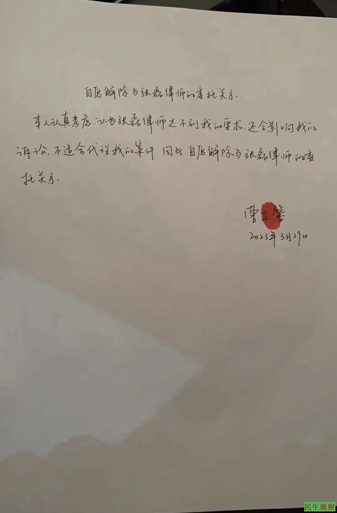 曹芷馨声称解除与张磊律师的委托关系 |