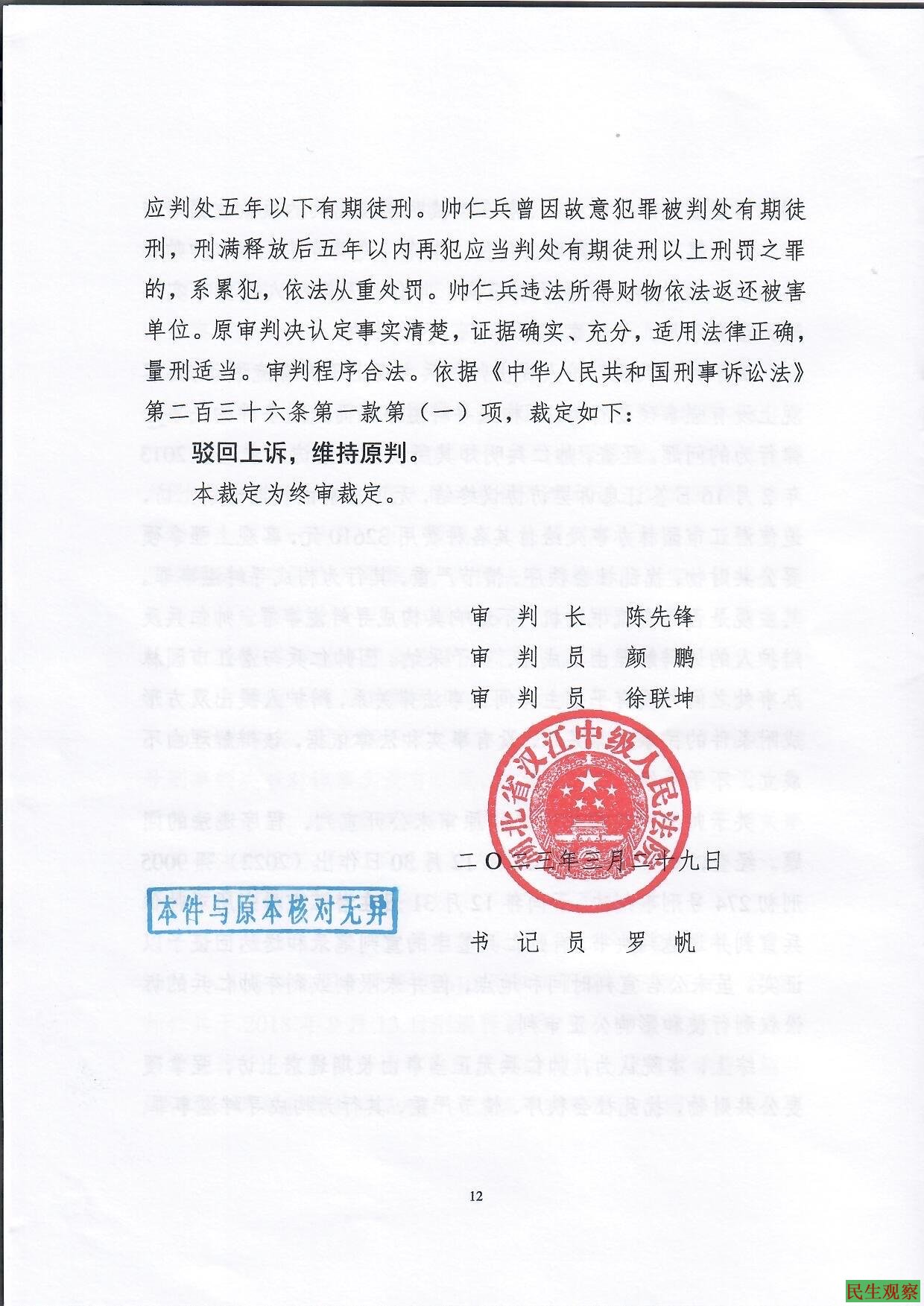 【民生观察2023年5月12日消息】湖北省仙桃市汉江中级人民法院在2023年3月29日不开庭秘密进行宣判,并且没有辩护律师到庭,剥夺了在押人员的正当辩护权,帅仁兵寻衅滋事罪二审维持原判三年六个月。
