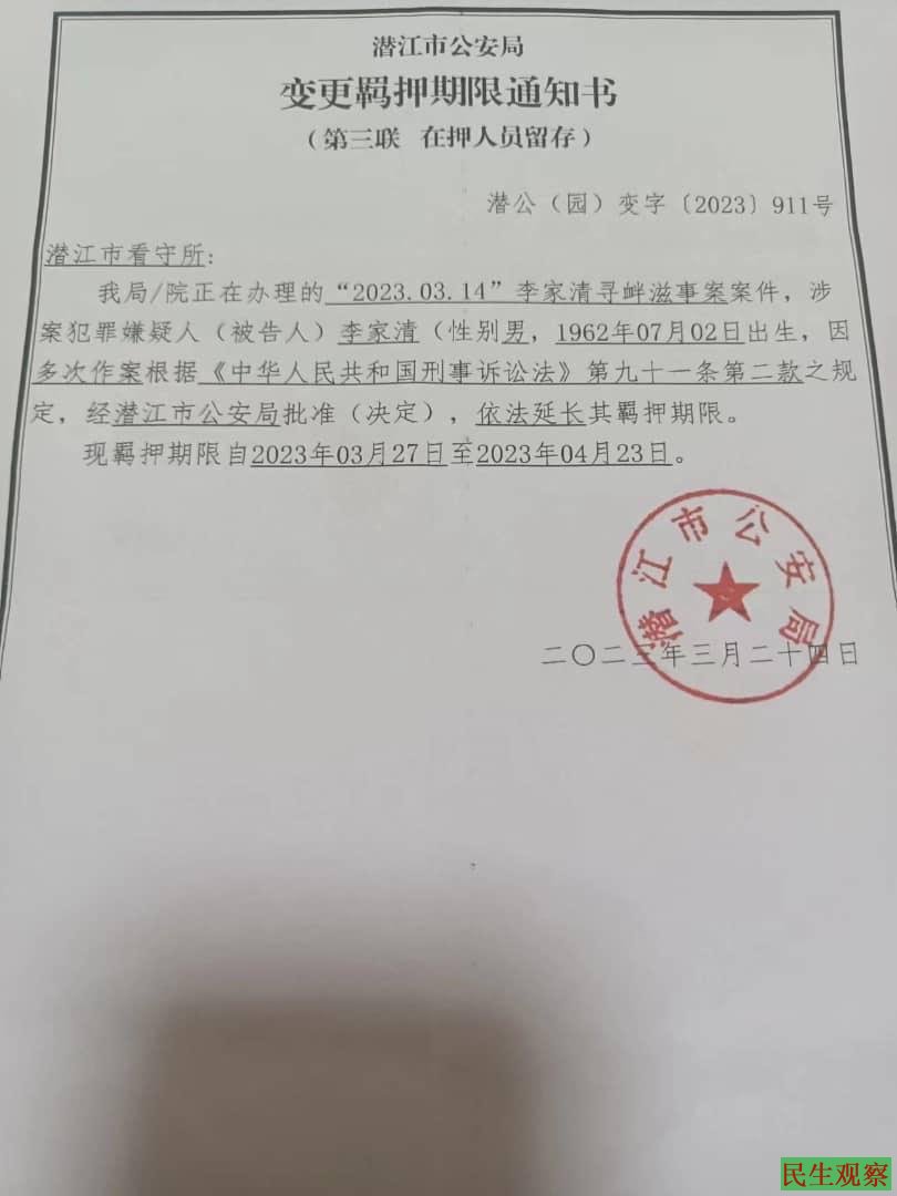 在2023年两会期间李家清在北京正常信访被当局政府部门接回潜江后被以扰乱单位办公秩序行政拘留10日、在3月20号潜江公安局随后又变更拘押期限以涉嫌寻衅滋事罪刑事拘留,到期时间为4月23日,在李家清拘押37天后的4月29日以涉嫌寻衅滋事罪拘留后遭到检察院核准逮蒱,现拘押在湖北潜江看守所。李家清案件过程与诉求全文如下: