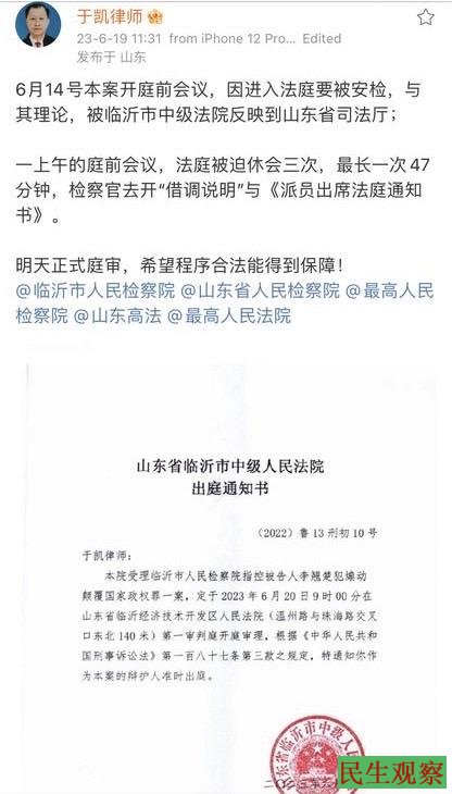 2023年6月14日,李翘楚案召开庭前会议,因进入法院要被安检,于凯律师与其理论,被临沂市中级法院反映到山东省司法厅;