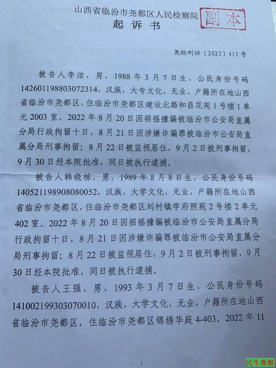 临汾圣约家园教会的李洁、韩晓栋、王强三位年轻的弟兄自2022年8月19日以来,先后以涉嫌“诈骗”被抓已经300多天,至今仍被羁押在临汾市尧都区看守所。现被尧都区检察院检察官王立宪、魏兵兵起诉到尧都区法院,三位弟兄被检察机关视为“犯罪集团”,“涉案”金额高达78万。