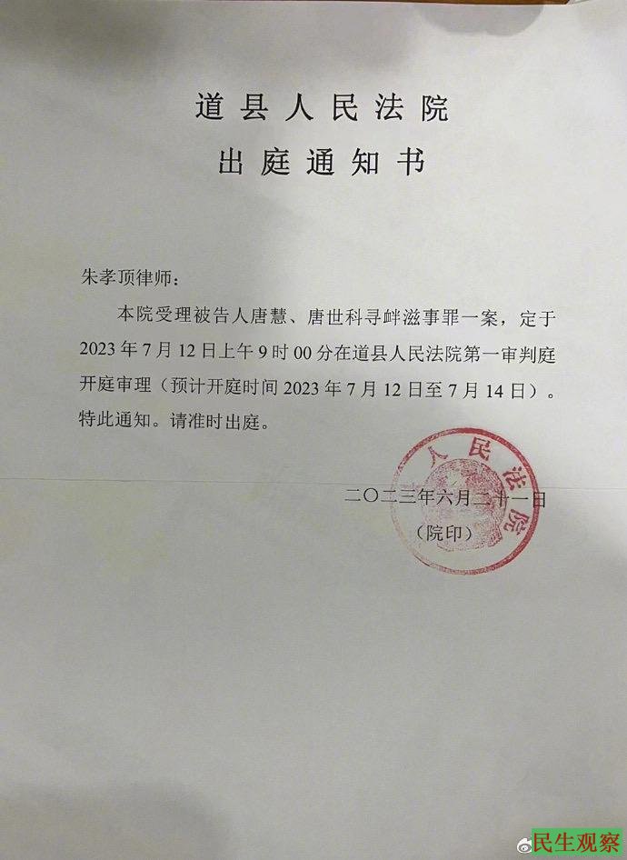 据朱孝顶律师微博消息,唐慧、唐世科兄妹被指控寻衅滋事一案,将于2023年7月12日在道县人民法院第一审判庭开庭审理,预计开庭时间2023年7月12日至7月14日。