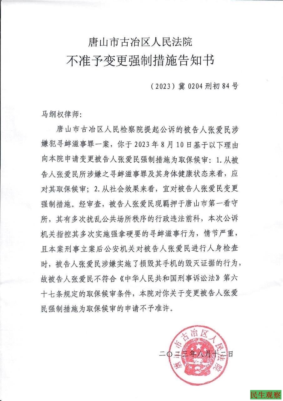代理律师与家属都提出递交了取保候审手续,随后法院不批准变更强制措施告知书,拒绝张爱民取保候审手续。强烈谴责唐山当局迫害维权人士的非法行为,立即停止迫害人权的行为,释放张爱民回家看病与家人团聚。