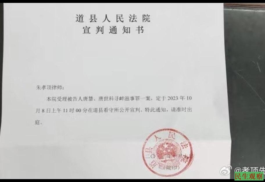 2023年10月8日上午11时,唐慧、唐世科寻衅滋事案在道县看守所会见室里宣判,二人分别被重判四年、三年半。