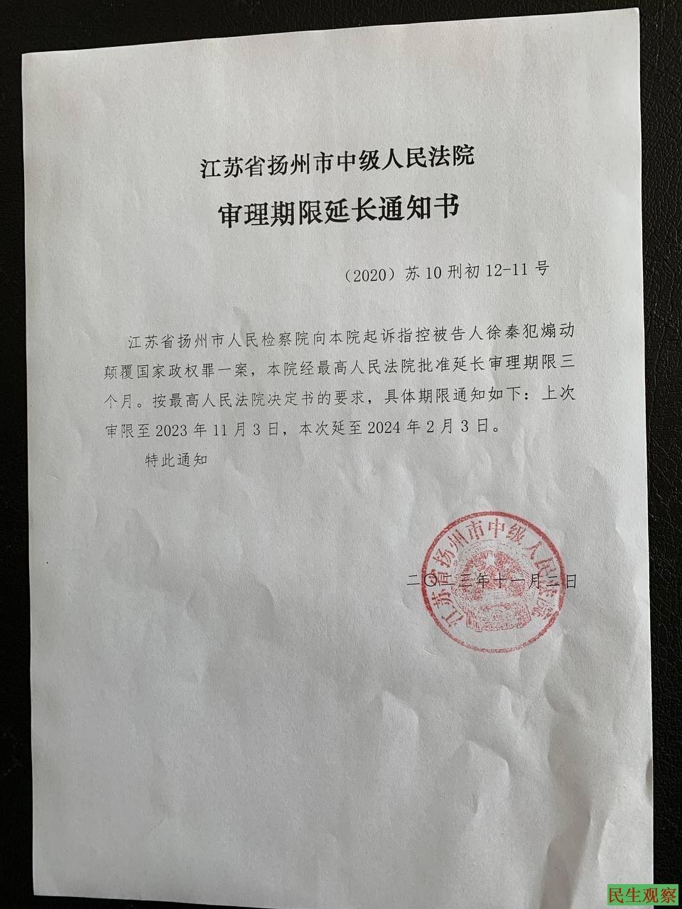 江苏省扬州市人民检察院向本院起诉指控被告人徐秦犯煽动颠覆国家政权罪一案,本院经最高人民法院批准延长审理期限三个月。按最高人民法院决定书的要求,具体期限通知如下:上次审限至2023年11月3日,本次延至2024年2月3日。