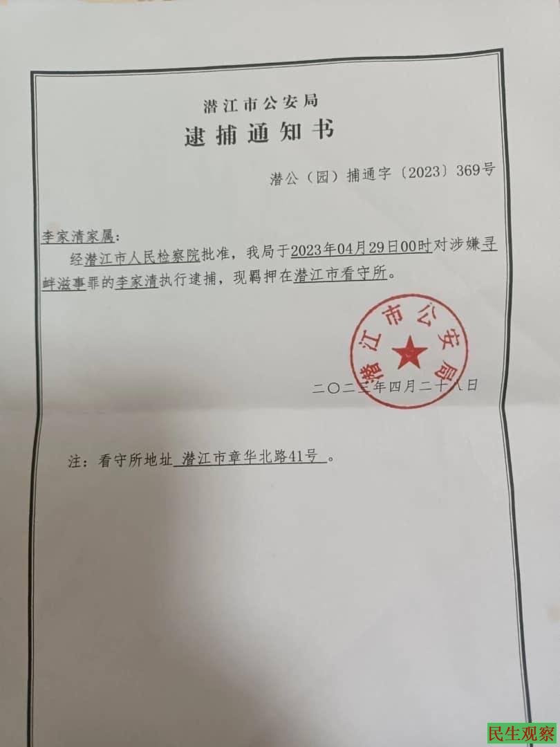 在2023年两会期间李家清在北京正常信访被当局政府部门接回潜江后被以扰乱单位办公秩序行政拘留10日、在3月20号潜江公安局随后又变更拘押期限以涉嫌寻衅滋事罪刑事拘留,到期时间为4月23日,在李家清拘押37天后的4月29日以涉嫌寻衅滋事罪拘留后遭到检察院核准逮蒱,一直拘押在湖北潜江看守所。李家清案件过程与诉求全文如下: