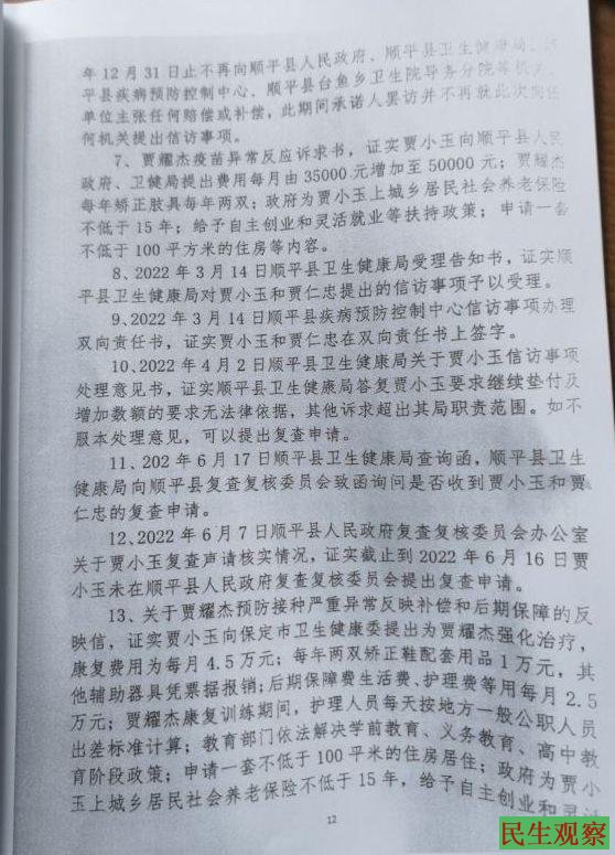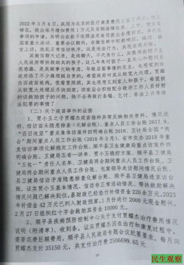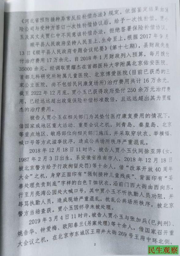 孩子事情一直没有进展,孩子也没有治疗费康复,看着可伶的孩子出生就被yi苗致残,父母心痛。2019年3.4日孩子妈妈贾小玉又到王府井大街拿着孩子的介绍喷绘布在那乞讨,过程也就10分钟不到被警察带走,警察说这地方是商业街不要在这地方乞讨,然后被顺平县疾控接回家。事情过后我们回到县里,等待县里给出解决办法,2019年3月15日,经过谈判,根据国家八部委《关于进一步做好预防接种异常反应处置工作的指导意见》(国卫疾控发【2014】19号)文件精神,我们签订了一个承诺书,县里每月支付孩子一定的治疗费(包括但不限于康复费治疗费,住宿费,生活费,营养费,路费等反正什么都在里面)。后来19,20,21年就这么一直维持看着病,孩子在不间断的康复下,认知等相关方面也有了很大的进步。在此期间,康复费已经涨了两次还是三次我忘了,医院有的项目都翻倍,医院大PT直接从150涨到300一个小时,住院押金也从3万调到5万一个月。22年4月中旬卫生局突然出了信访回复的一个含,没有法律依据继续垫付康复费,我们都很震惊,孩子正在向好的方面进步,我们微小的愿望就是儿子将来能够生活自理,这是一个父母多么绝望后的那么微小的奢望。后来经过争取又答应再给孩子看病,这样看病到22年的10月份正好北京开会(20大),他们要我们配合维稳回县里,这段时间不能在北京治疗,我们配合顺平县维稳人员回到县里,可我们回来3天把我们放宾馆看着,没有谈孩子事情,孩子妈妈和我生气就走了,去到隔壁县朋友家里住了几天,后来公安在宾馆审我三天,我说她生气走的,还骂了我,你们不谈,我也不知道去哪了。后来公安把她找到直接拘留15天,说是寻讯滋事,我不明白就去朋友家住了几天就犯罪了,没有任何理由。