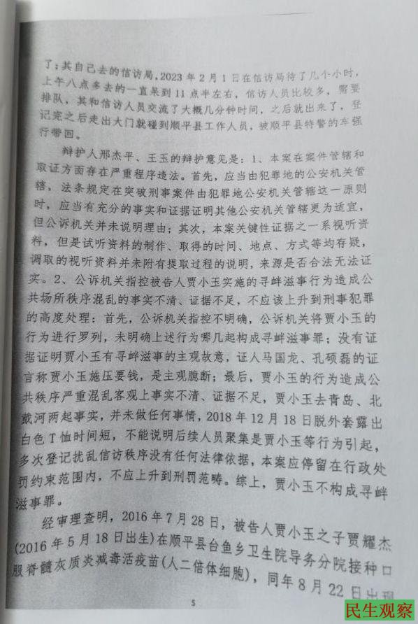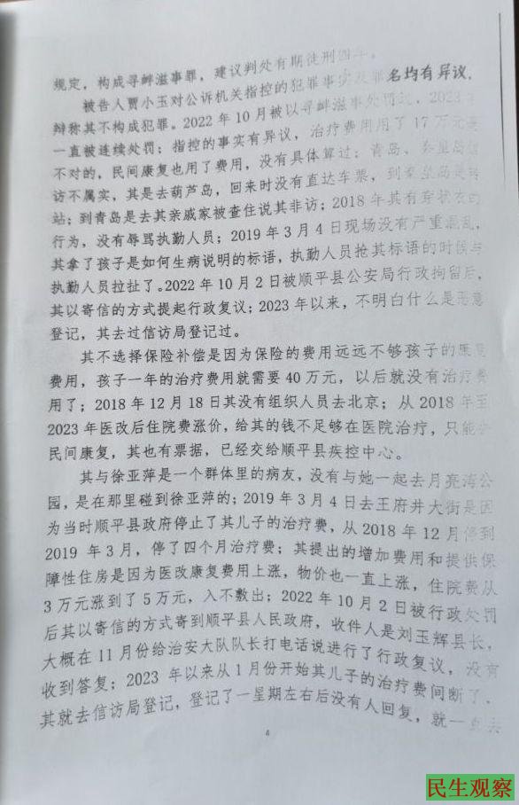 时隔5年,顺平检查院指控贾小玉在儿子治疗费没有的时候,在北京前门月亮湾别墅门前的募捐和北京王府井大街的募捐是寻衅滋事,北京国家信访局的信访是寻衅滋事,就连2018年被朋友邀请带孩子去葫芦岛散心,也被指控寻衅滋事,欲加之罪,何患无辞?