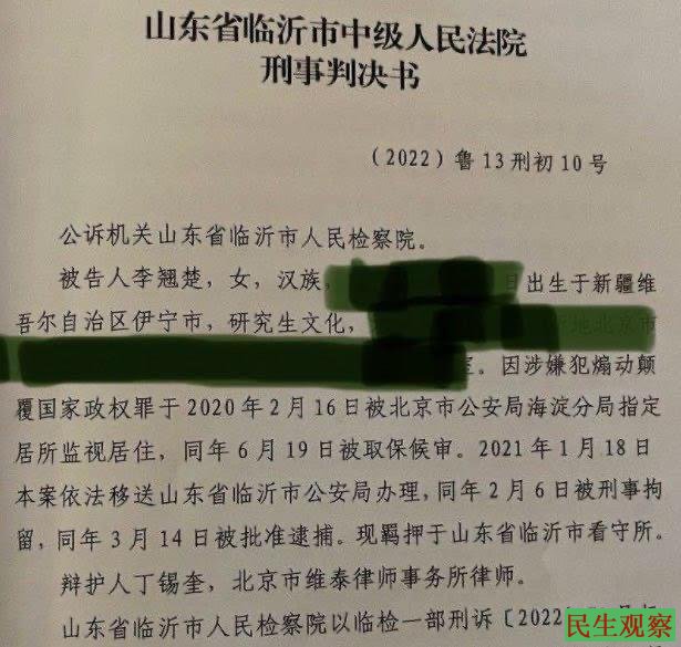 据其刑事判决书显示,李翘楚因涉嫌犯煽动颠覆国家政权罪于2020年2月16日,被北京市公安局海淀分局指定居所监视居住,同年6月19日被取保候审。2021年1月18日本案依法移送山东省临沂市公安局办理,同年2月6日被刑事拘留,同年3月14日被批准逮捕。现羁押于山东省临沂市看守所。该案辩护人是北京市维泰律师事务所律师丁锡奎。
