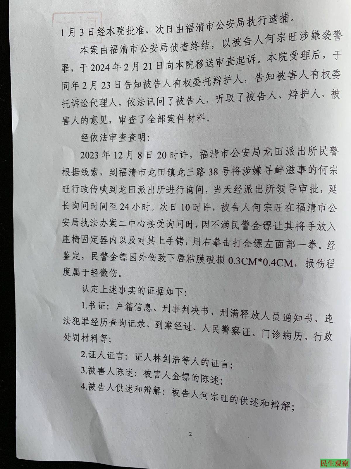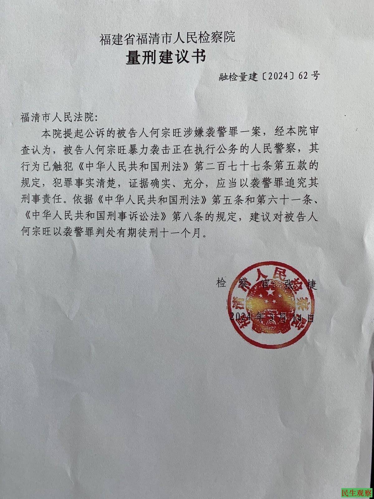 公诉机关福清检察院起诉何宗旺“袭警”,量刑建议是有期徒刑11个月。